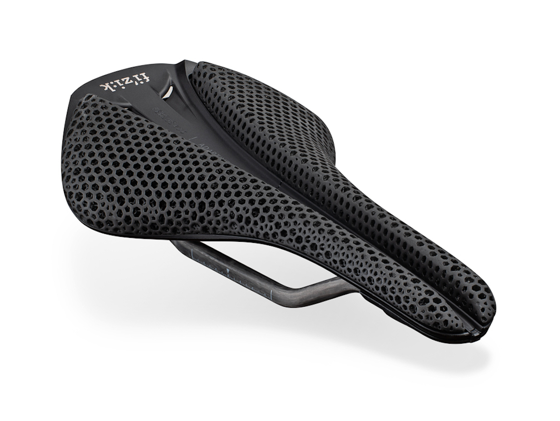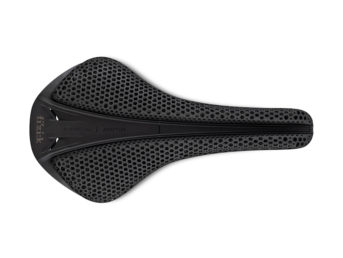 A 3D printed bike saddle with a revolutionary padding with carbon reinforced nylon shell and a highly stiff carbon rail (R1).