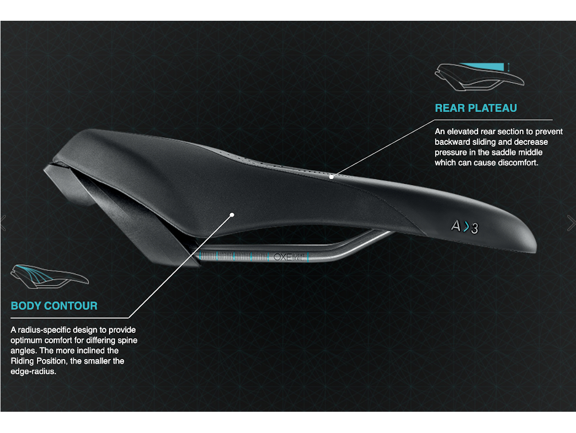Body Contour – A radius-specific design to provide optimum comfort for differing spine angles. The more inclined the Riding Position, the smaller the edge-radius.
