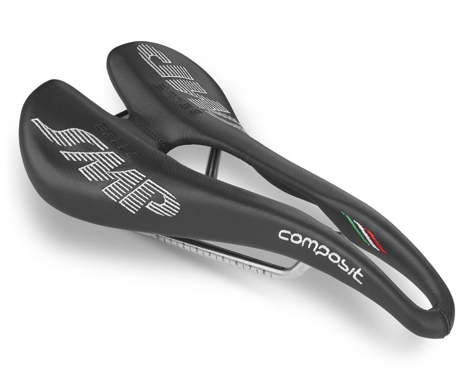 The Selle SMP Composit has the same structure and design as the Carbon models. The body in elastomerized Nylon 12 filled with carbon fiber is covered in real leather in the black versions and Lorica microfibre in the colored ones.